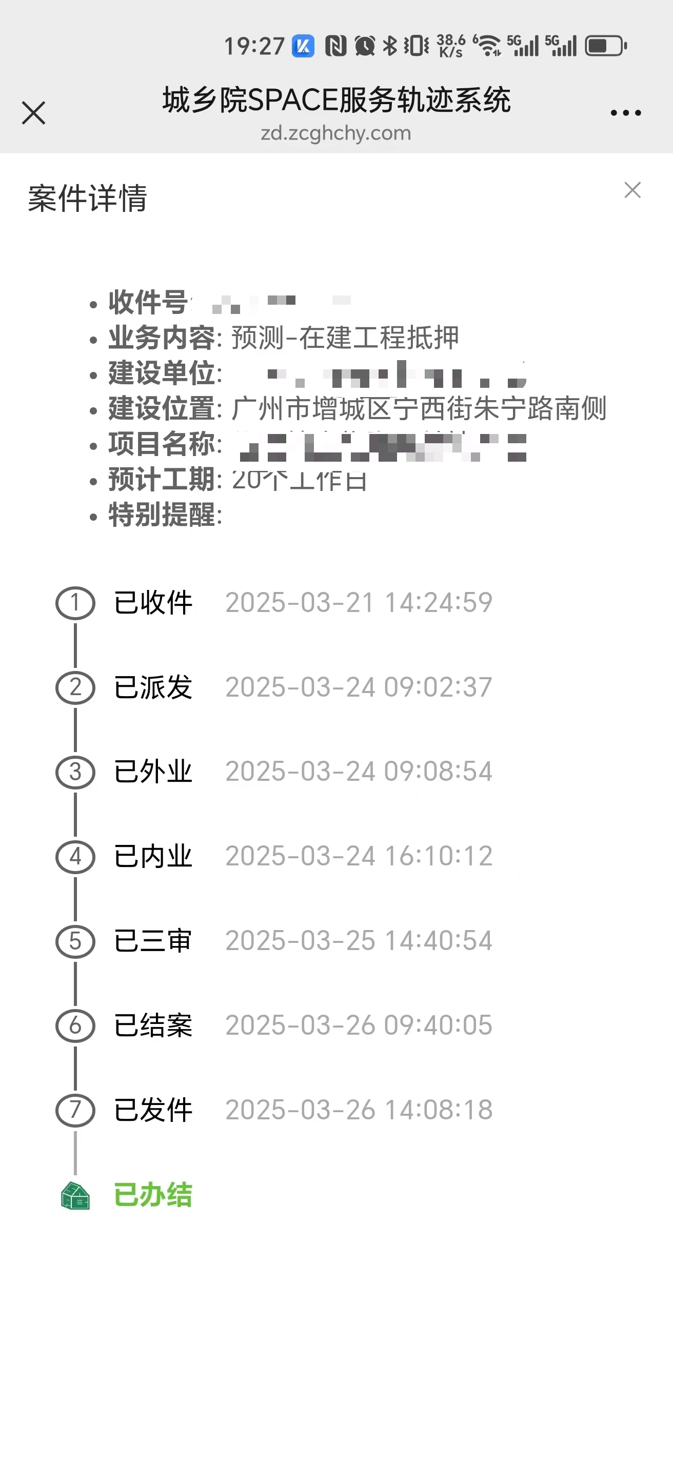 这背后,是一套“服务轨迹系统”在高效运转。该系统由广州市规划和自然资源局增城区分局与城乡院(广州)有限公司共同开发,将测绘业务流程像快递物流一样,按节点实时呈现办理状态,实现了业务进度可追溯、办理时限透明化、跨部门协同高效化。