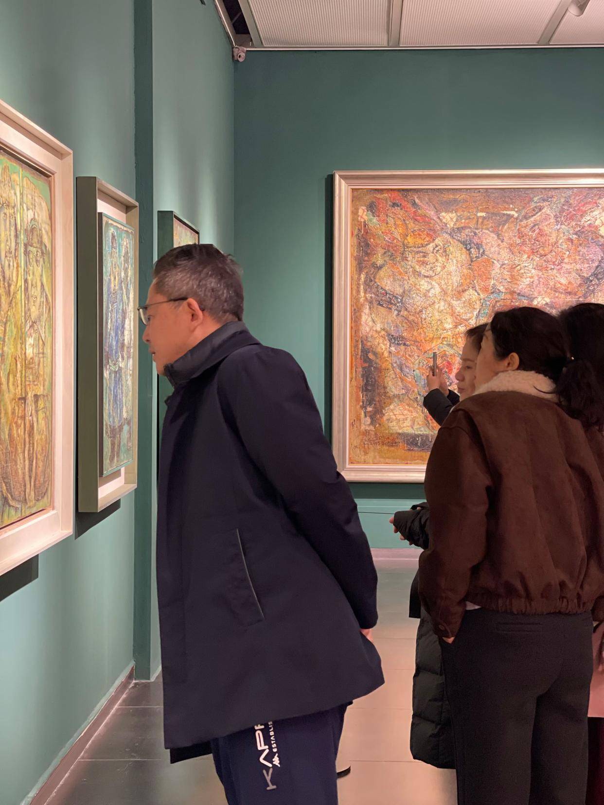 虽然同样以草原为主题,两位艺术家却展现出截然不同的艺术气质与精神维度。刘亚江的展览如同一部“激越的交响乐”。这位生于湖南、扎根内蒙古二十余载的画家,用大刀阔斧的笔触和浓烈奔放的色彩,捕捉骏马飞驰的瞬间力量。他的画作不止于描绘马匹的形态,更通过马的形象,承载了楚人浪漫豪情与草原辽阔胸怀的交融。在《万马奔腾新时代》中,观众能感受到一种扑面而来的生命动能与时代奋进的气息,恰如策展人李自健所言:“这是对马年奔腾气象的生动诠释。”李波的展览则仿佛一首“沉思的抒情诗”。作为土生土长的内蒙古画家,李波将草原的文化记忆与东方石窟壁画的审美精神相融合。他的画面斑驳凝重,人物仿佛从时间深处缓缓走来,不强调叙事,而追求一种超越时空的“种族记忆”显影。在《草原灵境》中,观众能沉浸于一片由色彩、肌理与时光共同构筑的静谧世界,感受游牧文明深沉而绵长的精神脉搏。南北交融:湖湘精神遇见草原魂魄刘亚江的创作轨迹本身就是一个文化融合的故事。这位毕业于中央工艺美院、师从吴冠中的湖南画家,自2000年起多次深入内蒙古草原,与牧民同吃同住,学习蒙古长调,将南方灵秀与北疆豪迈凝于笔端。他在前言中写道:“楚人之浪漫,是‘路漫漫其修远兮’的执着;草原之壮阔,是骏马踏破风沙的坦荡。二者相融,铸就天地情怀。”而李波则以蒙古族文化符号为语言,以中国传统艺术精神为骨架,搭建起游牧文明与中华美学的桥梁。他的作品连续五届入选全国美展,并获得内蒙古艺术最高奖“萨日纳”奖,展现出深厚的民族情感与当代转化能力。不止于看:一场沉浸式的文化体验展览现场不仅展示作品,更通过多种形式营造草原氛围。开幕式上,来自内蒙古锡林郭勒盟的“乌兰牧骑”金牌阵容带来马头琴、呼麦、长调等表演,让观众在视听交融中深入草原情境。